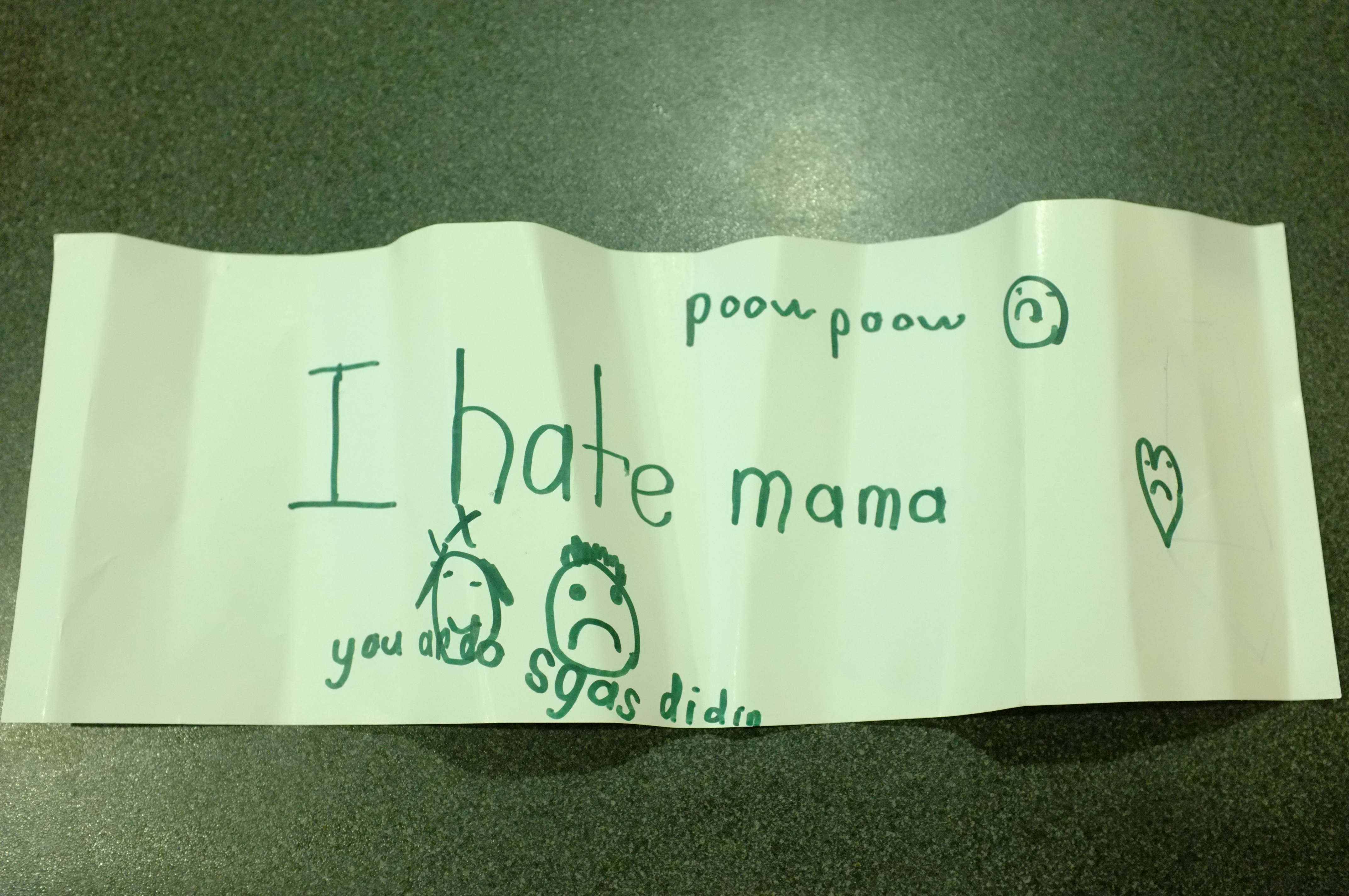 I looked again. Huh! So ‘hate’, bad as it was hadn’t been bad enough for expressing his indignation at me. “I hate Mama. You are disgusting.” Righto. That actually packs quite a punch. Thanks kid.